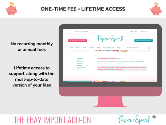 With the eBay import add-on, you can stop crawling through all your eBay reports to figure out your total sales & fees. Get the convenience of instantly totaling your eBay data and entering your eBay sales & expenses on your existing Seller Spreadsheet with this additional spreadsheet.