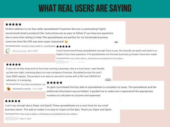 Paper + Spark has been selling spreadsheets since 2015. We currently support thousands of makers and creative entrepreneurs in doing their books and understanding their money. Our spreadsheets have received countless rave reviews from shop owners. No other bookkeeping solution out there offers our level of step-by-step guidance & support. We also stay up-to-date on e-commerce reporting and platform changes.
