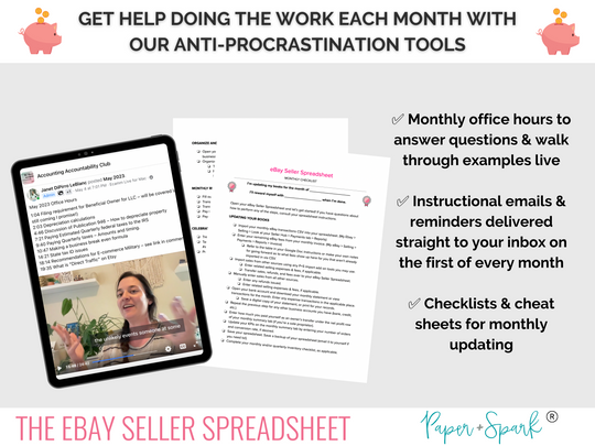 With a Paper + Spark spreadsheet, you’ll pay a one-time fee for lifetime access to your files and support. We provide any future year files and updates for free, forever, via the account you create at checkout. You can always reach out in the Accounting Accountability Club, or via DM or email, and get answers to your spreadsheet & bookkeeping questions.
