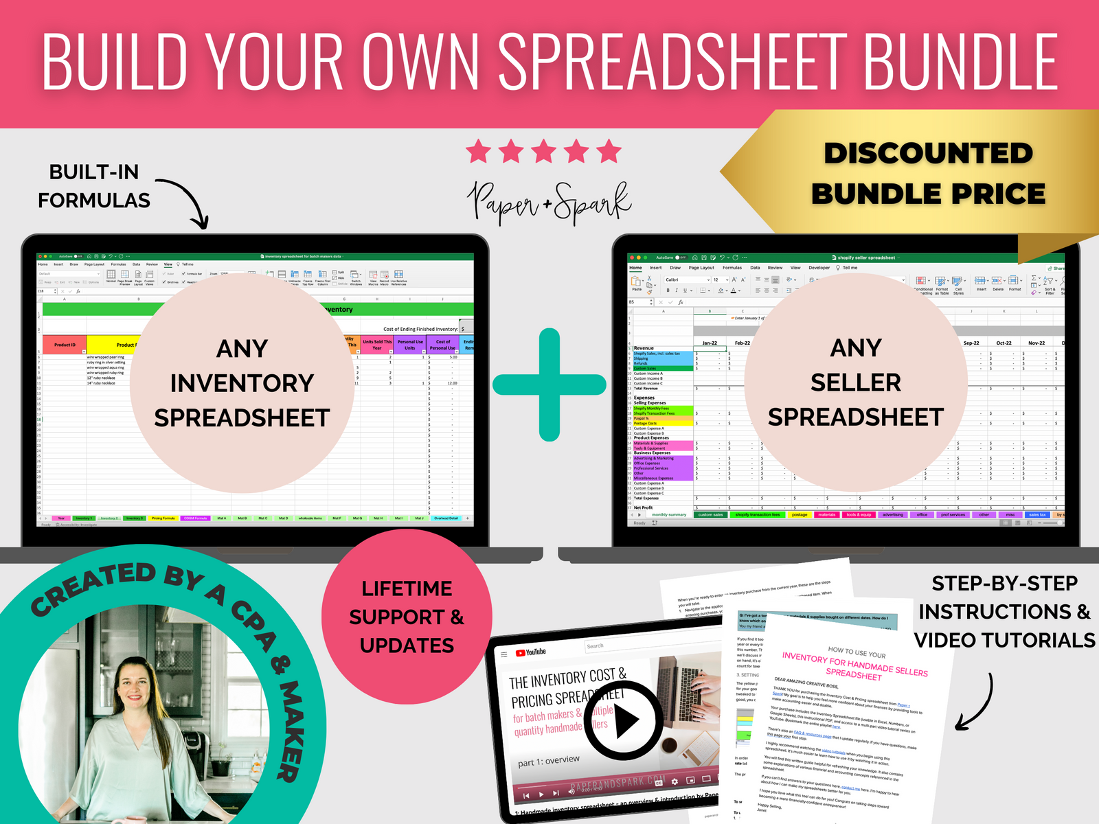 Physical inventory has its own special set of rules and tracking needs, so we’ve got a special super-powered spreadsheet to help you deal specifically with inventory. Each Paper + Spark inventory spreadsheet will assist you with tracking your inventory costs, setting a profitable price point for your goods, and calculating everything you need at tax time regarding your inventory.